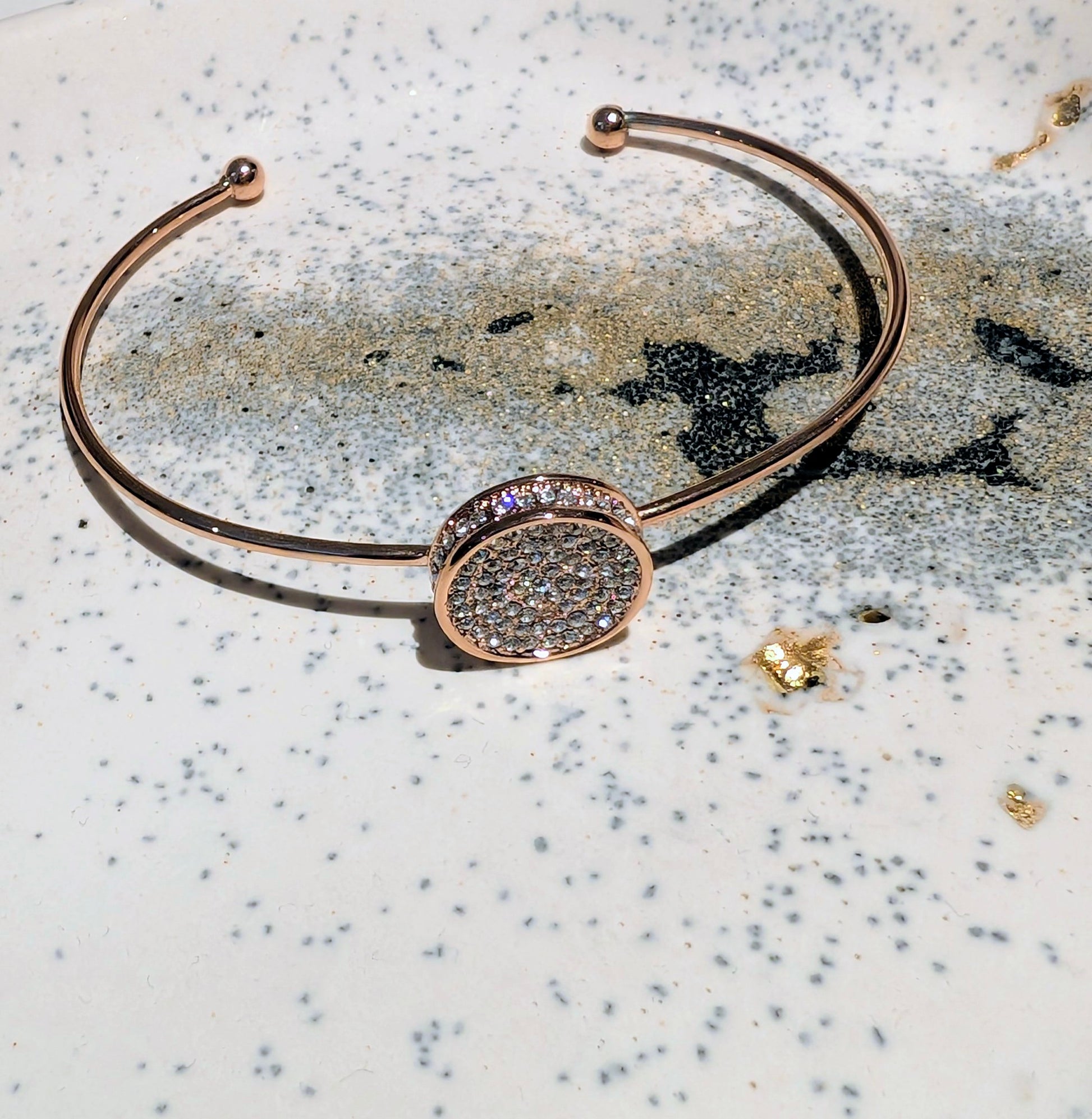 Dieser edle Armreif aus Edelstahl in Rosé Gold vereint zeitlose Eleganz mit modernem Glamour. Das filigrane Design wird durch ein rundes Mittelstück mit funkelnden Kristallen veredelt, die das Licht bei jeder Bewegung atemberaubend reflektieren.