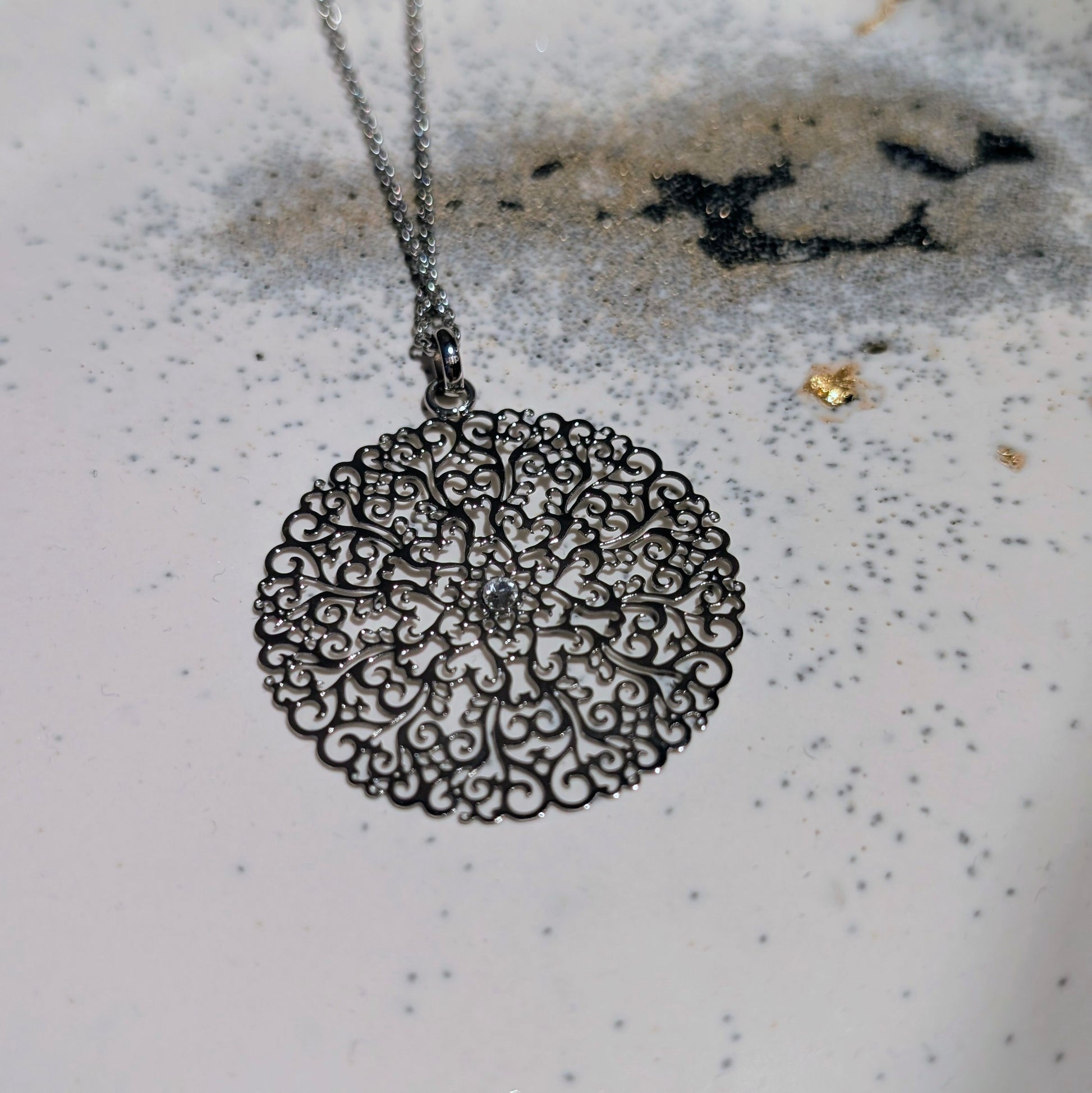 Diese Halskette aus Edelstahl überzeugt mit einem kunstvoll gearbeiteten Anhänger in edler Silber-Optik. Das filigrane Muster erinnert an ein Ornament und verleiht deinem Look einen Hauch von Boho-Chic und gleichzeitig zeitlose Eleganz. In der Mitte sorgt ein funkelnder Strassstein für das gewisse Extra.