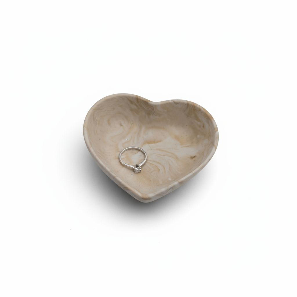 Die Herzschale Amora ist ein zartes Dekostück mit natürlicher, marmorierter Oberfläche – perfekt, um deinen Lieblingsschmuck stilvoll aufzubewahren. Mit einer Größe von ca. 8 cm passt sie wunderbar auf den Nachttisch, die Kommode oder ins Bad und bringt einen Hauch von Eleganz in jeden Raum. Ob als Ablage für Ringe, Ohrringe oder kleine Andenken – diese Schale vereint Funktionalität mit liebevoller Ästhetik.