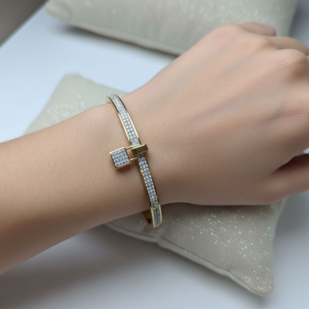 Dieser Armreif in gold ist mit vielen Strasssteinen besetzt und funkelt sehr schön. Er hat ein kleines Schloss als Accessoire dran.
