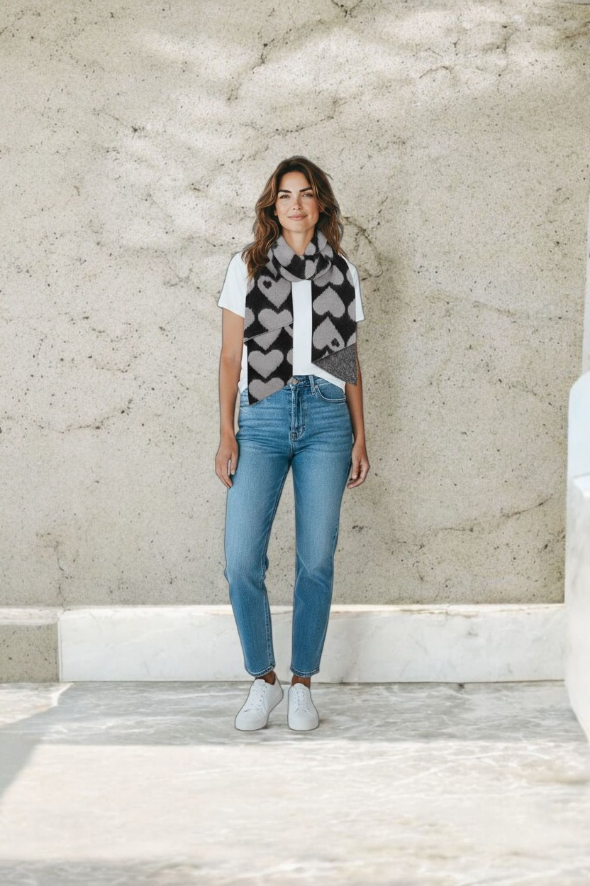 Der schwarze Ton verleiht ihm eine natürliche, elegante Ausstrahlung, während die zarten grauen Herzen einen liebevollen Farbakzent setzen. Diese besondere Kombination macht den Schal zu einem echten Lieblingsstück – perfekt, um jedem Outfit eine warme und feminine Note zu geben.