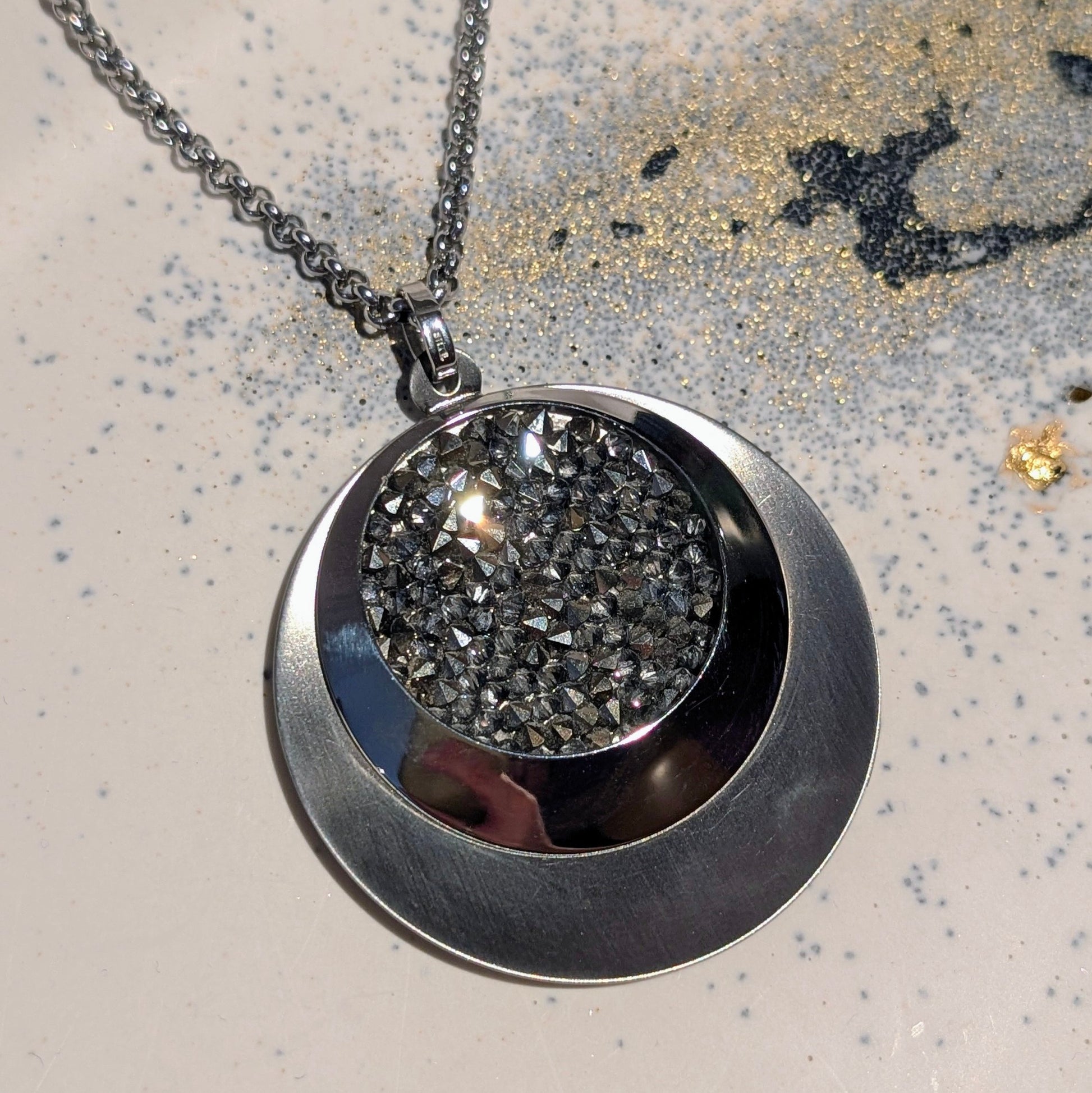 Diese Halskette zieht garantiert alle Blicke auf sich. Der runde Anhänger kombiniert kühles Edelstahl mit einer auffälligen Inlay-Struktur aus facettierten Kristallen, die im Licht intensiv glitzern. Der Mix aus klarer Form und rougher Textur macht dieses Piece zu einem echten Statement.